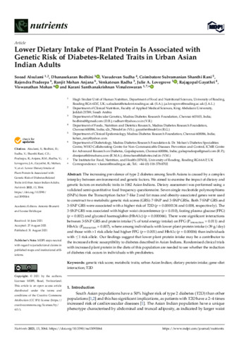 Lower dietary intake of plant protein is associated with genetic risk of diabetes-related traits in urban Asian Indian adults.
