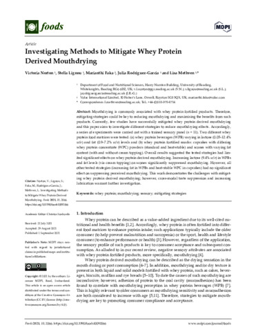 Norton, V. orcid id iconORCID: https://orcid.org/0000-0002-1961-2539, Lignou, S. orcid id iconORCID: https://orcid.org/0000-0001-6971-2258, Faka, M., Rodriguez-Garcia, J. orcid id iconORCID: https://orcid.org/0000-0002-4986-3144 and Methven, L. orcid id iconORCID: https://orcid.org/0000-0001-6940-7579 (2021) Investigating methods to mitigate whey protein derived mouthdrying. Foods, 10 (9). 2066. ISSN 2304-8158 doi: 10.3390/foods10092066