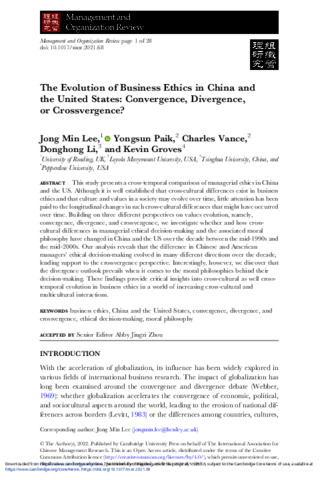 Lee, J. M., Paik, Y., Vance, C., Li, D. and Groves, K. (2022) The evolution of business ethics in China and the United States: convergence, divergence or crossvergence? Management and Organization Review, 18 (4). pp. 658-685. ISSN 1740-8784 doi: 10.1017/mor.2021.68