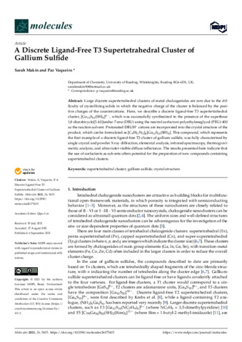 Makin, S. and Vaqueiro, P. orcid id iconORCID: https://orcid.org/0000-0001-7545-6262 (2021) A discrete ligand-free T3 supertetrahedral cluster of gallium sulfide. Molecules, 26 (17). 5415. ISSN 1420-3049 doi: 10.3390/molecules26175415