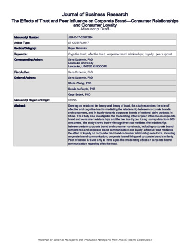 Ozdemir, S., Zhang, S., Gupta, S. and Bebek, G. orcid id iconORCID: https://orcid.org/0000-0002-3597-381X (2020) The effects of trust and peer influence on corporate brand—Consumer relationships and consumer loyalty. Journal of Business Research, 117. pp. 791-805. ISSN 0148-2963 doi: 10.1016/j.jbusres.2020.02.027