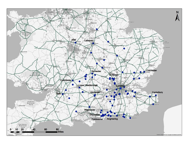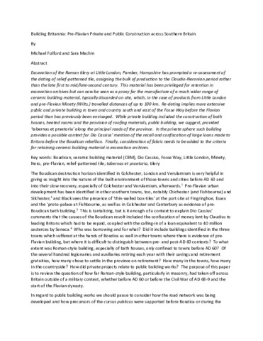 Excavation of the Roman tilery at Little London, Pamber, Hampshire has prompted a re-assessment of the dating of relief-patterned tile, assigning the bulk of production to the Claudio-Neronian period rather than the late first to mid/late-second century. This material has been privileged for retention in excavation archives but can now be seen as a proxy for the manufacture of a much wider range of ceramic building material, typically discarded on site, which, in the case of products from Little London and pre-Flavian Minety (Wilts.) travelled distances of up to 100 km. Re-dating implies more extensive public and private building in town and country south and east of the Fosse Way before the Flavian period than has previously been envisaged. While private building included the construction of bath houses, heated rooms and the provision of roofing materials, public building, we suggest, provided ‘tabernas et praetoria’ along the principal roads of the province. In the private sphere such building provides a possible context for Dio Cassius’ mention of the recall and confiscation of large loans made to Britons before the Boudican rebellion. Finally, consideration of fabric needs to be added to the criteria for retaining ceramic building material in excavation archives.