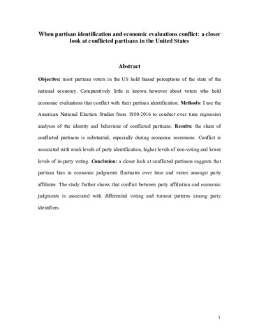 Objective Most partisan voters in the United States hold biased perceptions of the state of the national economy. Comparatively little is known, however, about voters who hold economic evaluations that conflict with their partisan identification. Methods I use the American National Election Studies from 1980 to 2016 to conduct over time regression analyses of the identity and behavior of conflicted partisans. Results The share of conflicted partisans is substantial, especially during economic recessions. Conflict is associated with weak levels of party identification, higher levels of nonvoting, and lower levels of in-party voting. Conclusion A closer look at conflicted partisans suggests that partisan bias in economic judgments fluctuates over time and varies among party affiliates. The study further shows that conflict between party affiliation and economic judgments is associated with differential voting and turnout patterns among party identifiers.