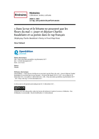 Rolland, N. (2021) '"Dans la rue et le bitume ne poussent que les fleurs du mal": jouer et déjouer Charles Baudelaire et sa poésie dans le rap français'. Itinéraires, 3. ISSN 2427-920X doi: 10.4000/itineraires.9377