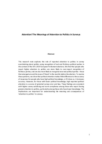 This research note explores the role of reported attention to politics in survey overclaiming about politics. Using recognition of real and fictitious political parties in the context of the UK's 2019 European Parliament elections, we find that people who report higher attention to politics are more likely to over-report recognition of fictitious parties, and are also more likely to recognize new real political parties - those that emerged around the issue of ‘Brexit’ in the months before the election. To resolve these patterns, we show that political attention makes little difference to the accuracy of responses for people who have high political knowledge, or if it does so, it increases accuracy. However, for those with lower political knowledge, high reported political attention is a source of potential survey error and bias. These findings are consistent with higher survey satisficing and norm compliance among those who report having greater attention to politics, particularly among those who have lower knowledge. The implications are important for understanding the meaning and consequences of ‘attention to politics’ in surveys.