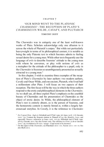 Plato’s Charmides is notable as being the only Platonic text in which Socrates admits to feeling sexual desire for a young man. This paper examines three different receptions of this text: Oscar Wilde’s 666-line poem Charmides, C. P. Cavafy’s 8-line poem In a town of Osroene (Ἐν πόλει τῆς Ὀσροηνῆς), and Plutarch’s much earlier Life of Alcibiades. It focus on how the three authors respond to the erotic and philosophical element in the Charmides. Wilde’s 1881 Charmides provides an example of minimal textual engagement: the name Charmides is invoked solely for its connotations of young, male beauty; the tone is erotically charged but the homoerotic content is muted, and the philosophical element entirely absent. In Cavafy’s In a town of Osroene, first printed in 1917, explicit allusion to ‘the Platonic Charmides’ in the last line recasts the poem an expression of homoerotic desire, and endows its group of young men with the prestige of a Platonic gathering and Platonic love. In contrast, Plutarch’s engagement with the Charmides in his Life of Alcibiades is implicit, and depends entirely on the reader’s ability to recognise a series of detailed verbal echoes. Furthermore, while calling to mind the educational conversation with which Socrates engaged Charmides, Plutarch denies that Socrates’ motivation was sexual, and integrates allusion to the Charmides into a broader network of allusions to other passages in which Plato describes Socrates’ encounters with beautiful young men, or the ideal relationship of a mature man with a younger beloved, in which the sexual element is entirely absent. In so doing, Plutarch “corrects” Plato with Plato, and removes what had become an embarrassment in his period.