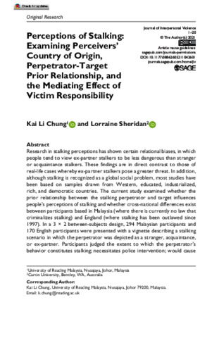 Perceptions of stalking: examining perceivers' country of origin, perpetrator-target prior relationship, and the mediating effect of victim responsibility.
