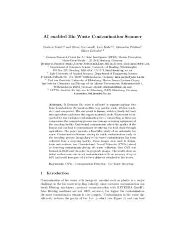 In Germany Bio waste is collected in separate garbage bins from households in the municipalities (e.g. garden waste, kitchen waste, etc.) and composted. The end result is humus, which is finally fed back into agriculture and closes the organic materials cycle. Waste must be inspected for non-biological contaminants prior to composting, as these can compromise the composting process and damage screening equipment at the recycling facility. Undetected contaminants affect the quality of the humus and can lead to contaminants re-entering the food chain through agriculture. The paper presents a feasibility study of an automatic bio waste Contamination-Scanner aiming to catch contamination early in the recycling process. Image data of bio waste contamination has been collected from a recycling facility. These images were used to design, train and evaluate two Convolutional Neural Networks (CNNs) aimed at detecting contaminants during bio waste collection. One CNN was trained on RGB and the other on greyscale images. The results show an initial surface scan can detect contamination with an accuracy of up to 86\ and could form part of a holistic detector attached to bin lorries.