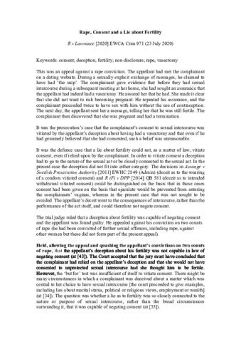 Krebs, B. (2020) Rape, consent and a lie about fertility: R v Lawrance [2020] EWCA Crim 971. Journal of Criminal Law, 84 (6). pp. 622-625. ISSN 1740-5580 doi: 10.1177/0022018320976662