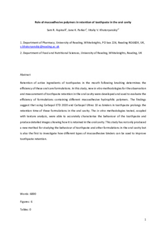 Retention of active ingredients of toothpastes in the mouth following brushing determines the efficiency of these oral care formulations. In this study, new in vitro methodologies for the observation and measurement of toothpaste retention in the oral cavity were developed and used to evaluate the efficiency of formulations containing different mucoadhesive hydrophilic polymers. The findings suggest that using Carbopol ETD 2020 and Carbopol Ultrez 10 as binders in toothpaste prolongs the retention time of these formulations in the oral cavity. The in vitro methodologies tested, coupled with texture analysis, were able to accurately characterise the behaviour of the toothpaste and produce detailed images showing how it is retained in the oral cavity. This study has not only produced a new method for studying the behaviour of toothpaste and other formulations in the oral cavity but is also the first to investigate how different types of mucoadhesive binders can be used to improve toothpaste retention.