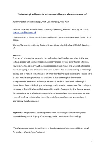 | Uncontrolled Keywords | Entrepreneurial leadership; Innovation; Technological determinism; Actor-network theory; social shaping of technology; social construction of technology |