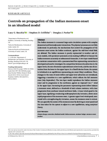 Recchia, L. G. orcid id iconORCID: https://orcid.org/0000-0002-5907-9468, Griffiths, S. D. and Parker, D. J. (2021) Controls on propagation of the Indian monsoon onset in an idealised model. Quarterly Journal of the Royal Meteorological Society, 147 (741). pp. 4010-4031. ISSN 1477-870X doi: 10.1002/qj.4165