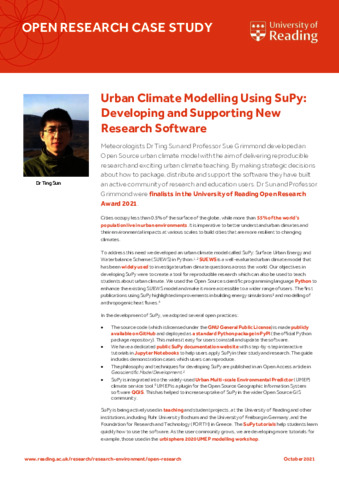 Meteorologists Dr Ting Sun and Professor Sue Grimmond developed an Open Source urban climate model with the aim of delivering reproducible research and exciting urban climate teaching. By making strategic decisions about how to package, distribute and support the software they have built an active community of research and education users. Dr Sun and Professor Grimmond were finalists in the University of Reading Open Research Award 2021.