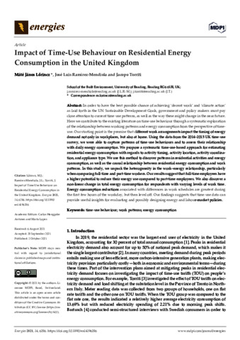 Lorincz, M. J. orcid id iconORCID: https://orcid.org/0000-0002-3853-0918, Ramirez-Mendiola, J. L. orcid id iconORCID: https://orcid.org/0000-0001-7666-7440 and Torriti, J. orcid id iconORCID: https://orcid.org/0000-0003-0569-039X (2021) Impact of time-use behaviour on residential energy consumption in the United Kingdom. Energies, 14 (19). 6286. ISSN 1996-1073 doi: 10.3390/en14196286