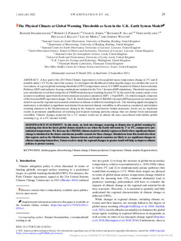 Swaminathan, R. orcid id iconORCID: https://orcid.org/0000-0001-5853-2673, Parker, R. J., Jones, C. G., Allan, R. P. orcid id iconORCID: https://orcid.org/0000-0003-0264-9447, Quaife, T. orcid id iconORCID: https://orcid.org/0000-0001-6896-4613, Kelley, D. I., de Mora, L. and Walton, J. (2022) The physical climate at global warming thresholds as seen in the UK Earth system model. Journal of Climate, 35 (1). pp. 29-48. ISSN 0894-8755 doi: 10.1175/JCLI-D-21-0234.1