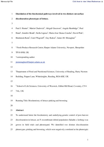 Hunter, P. J., Chadwick, M., Graceson, A., Hambidge, A., Hand, P., Heath, J., Lignou, S. orcid id iconORCID: https://orcid.org/0000-0001-6971-2258, Oruna-Concha, M. J. orcid id iconORCID: https://orcid.org/0000-0001-7916-1592, Pink, D., Bindukala, R., Wagstaff, C. orcid id iconORCID: https://orcid.org/0000-0001-9400-8641, Burker, G. and Monaghan, J. M. (2022) Elucidation of the biochemical pathways involved in two distinct cut-surface discolouration phenotypes of lettuce. Postharvest Biology and Technology, 183. 111753. ISSN 0925-5214 doi: 10.1016/j.postharvbio.2021.111753