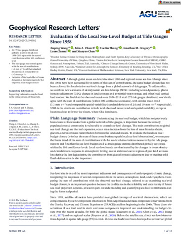 Wang, J., Church, J. A., Zhang, X., Gregory, J. M. orcid id iconORCID: https://orcid.org/0000-0003-1296-8644, Zanna, L. and Chen, X. (2021) Evaluation of the local sea-level budget at tide gauges since 1958. Geophysical Research Letters, 48 (20). e2021GL094502. ISSN 0094-8276 doi: 10.1029/2021GL094502