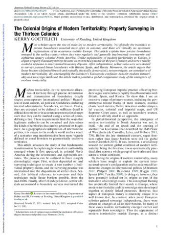 Most scholars agree the rise of states led to modern territoriality. Yet globally the transition to precise boundaries occurred most often in colonies, and there are virtually no systematic explanations of its occurrence outside Europe. This article explains how precise boundaries emerged in the earliest context where they were regularly and generally implemented: 17th- and 18th-century colonial North America. Unlike explanations of modern territoriality in Europe, it argues property boundary surveys became an entrenched practice on the part of settlers and were a readily available response to intercolonial boundary disputes. After independence, settlers accustomed to surveys pursued linear boundaries with Britain, Spain, and Russia. Moreover, the article argues that linear borders (delimited linearly and typically physically demarcated), not sovereignty, are constitutive of ‘modern territoriality’. By disentangling the literature’s Eurocentric confusion between modern territoriality and sovereign statehood, the article makes possible a global comparative study of the emergence of modern territoriality.