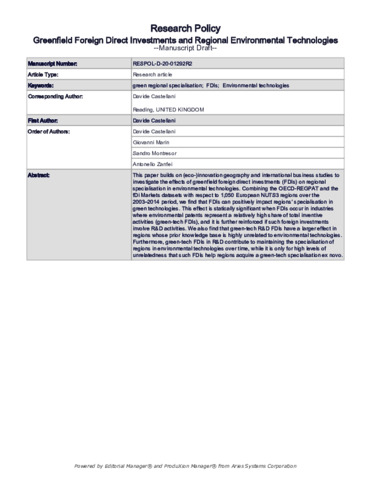 Castellani, D. orcid id iconORCID: https://orcid.org/0000-0002-1823-242X, Marin, G., Montresor, S. and Zanfei, A. (2022) Greenfield foreign direct investments and regional environmental technologies. Research Policy, 51 (1). 104405. ISSN 0048-7333 doi: 10.1016/j.respol.2021.104405