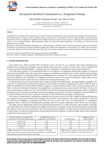 Siddall, M., Essah, E. orcid id iconORCID: https://orcid.org/0000-0002-1349-5167 and Harvie-Clark, J. (2021) Advanced cold roof construction in a temperate climate. In: 1st International Conference on Moisture in Buildings 2021 (ICMB21), 28-29 Jun 2021, UCL London, UK. doi: 10.14293/ICMB210060