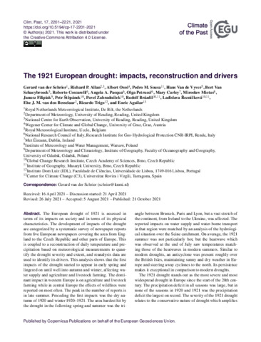 The European drought of 1921 is assessed in terms of its impacts on society and in terms of its physical characteristics. The development of impacts of the drought are categorized by a systematic survey of newspaper reports from five European newspapers covering the area from England to the Czech Republic and other parts of Europe. This is coupled to a reconstruction of daily temperature and precipitation based on meteorological measurements to quantify the drought severity and extent, and reanalysis data are used to identify its drivers. This analysis shows that the first impacts of the drought started to appear in early spring and lingered on until well into autumn and winter, affecting water supply and agriculture and livestock farming. The dominant impact in western Europe is on agriculture and livestock farming while in central Europe the effects of wildfires were reported on most often. The peak in the number of reports is in late summer. Preceding the first impacts was the dry autumn of 1920 and winter 1920–1921. The area hardest hit by the drought in the following spring and summer was the triangle between Brussels, Paris and Lyon, but a vast stretch of the continent, from Ireland to the Ukraine, was affected. The reported impacts on water supply and water-borne transport in that region were matched by an analysis of the hydrological situation over the Seine catchment. On average, the 1921 summer was not particularly hot, but the heatwave which was observed at the end of July saw temperatures matching those of the heatwaves in modern summers. Similar to modern droughts, an anticyclone was present roughly over the British Isles, maintaining sunny and dry weather in Europe and steering away cyclones to the north. Its persistence makes it exceptional in comparison to modern droughts. The 1921 drought stands out as the most severe and most widespread drought in Europe since the start of the 20th century. The precipitation deficit in all seasons was large, but in none of the seasons in 1920 and 1921 was the precipitation deficit the largest on record. The severity of the 1921 drought relates to the conservative nature of drought which amplifies the lack of precipitation in autumn and winter into the following spring and summer.
