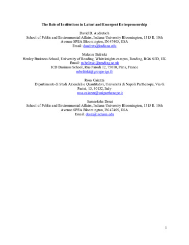 Audretsch, D. B., Belitski, M., Caiazza, R. and Desai, S. (2022) The role of institutions in latent and emergent entrepreneurship. Technical Forecasting and Social Change, 174. 121263. ISSN 0040-1625 doi: 10.1016/j.techfore.2021.121263