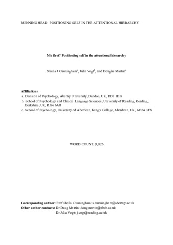 Cunningham, S., Vogt, J. orcid id iconORCID: https://orcid.org/0000-0002-3178-2805 and Martin, D. (2022) Me first? Positioning self in the attentional hierarchy. Journal of Experimental Psychology: Human Perception and Performance, 48 (2). pp. 115-127. ISSN 0096-1523 doi: 10.1037/xhp0000976