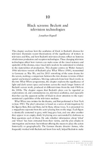 This chapter analyses the aesthetics of Beckett’s dramas for TV, in relation to theorisations of the significance of texture in television and film, and histories of television production and reception technologies. It compares Walter Asmus’s 1986 television version of Was Wo [What Where] with his 2013 reworking of the same drama for the screen. The earlier version was broadcast in 625 line video, limiting contrasts between light and dark, whereas the 2013 What Where is in HD digital format, enhancing image clarity but stretching the limits of TV technology for the representation of black. These technical and aesthetic comparisons are placed in the context of Beckett’s earlier screen dramas of the 1960s and 1970s, which also exploited and challenged the video and film technologies used to produce them. By focusing on black, the chapter explores the significance of unlit space and texture in Beckett’s screen work. It argues that Beckett’s TV work uses the apparent nullity of black to draw attention to the representational capabilities of the TV screen, and links visual style to the materiality of television technologies.