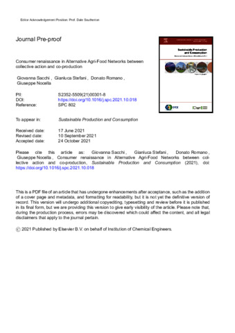 Sacchi, G., Stefani, G., Romano, D. and Nocella, G. orcid id iconORCID: https://orcid.org/0000-0001-9625-6315 (2022) Consumer renaissance in Alternative Agri-Food Networks between collective action and co-production. Sustainable Production and Consumption, 29. pp. 311-327. ISSN 2352-5509 doi: 10.1016/j.spc.2021.10.018