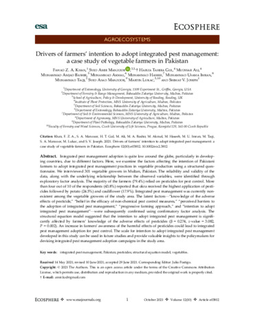 Abstract: Integrated pest management adoption is quite low around the globe, particularly in developing countries, due to different factors. Here, we examine the factors affecting the intention of Pakistani farmers to adopt integrated pest management practices in vegetable production using a structured questionnaire. We interviewed 301 vegetable growers in Multan, Pakistan. The reliability and validity of the data, along with the underlying relationship between the observed variables, were identified through exploratory factor analysis. The majority of the farmers (79.4%) relied on pesticides for pest control. More than four out of 10 of the respondents (43.8%) reported that okra received the highest application of pesticides followed by potato (24.5%) and cauliflower (17.9%). Integrated pest management was currently non‐existent among the vegetable growers of the study area. The latent factors—“knowledge of the adverse effects of pesticide,” “belief in the efficacy of non‐chemical pest control measures,” “perceived barriers to the adoption of integrated pest management,” “progressive farming approach,” and “intention to adopt integrated pest management”—were subsequently confirmed using confirmatory factor analysis. The structural equation model suggested that the intention to adopt integrated pest management is significantly affected by farmers’ knowledge of the adverse effects of pesticides (β = 0.274, z‐value = 3.082, P = 0.002). An increase in farmers’ awareness of the harmful effects of pesticides could lead to integrated pest management adoption for pest control. The scale for intention to adopt integrated pest management developed in this study can be used in future studies and provide valuable insights to the policymakers for devising integrated pest management adoption campaigns in the study area.