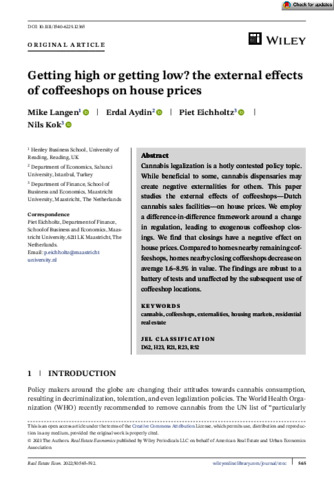 Langen, M. orcid id iconORCID: https://orcid.org/0000-0002-9116-4654, Aydin, E., Eichholtz, P. and Kok, N. (2022) Getting high or getting low? The external effects of coffeeshops on house prices. Real Estate Economics, 50 (2). pp. 565-592. ISSN 1540-6229 doi: 10.1111/1540-6229.12365