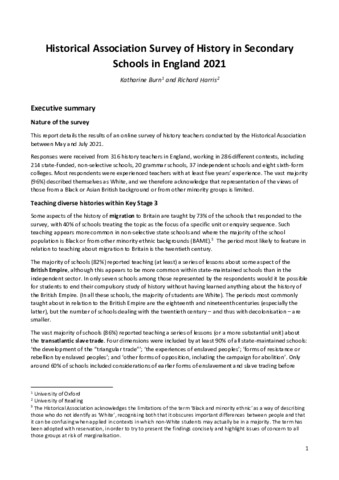 Executive summary Nature of the survey This report details the results of an online survey of history teachers conducted by the Historical Association between May and July 2021. Responses were received from 316 history teachers in England, working in 286 different contexts, including 214 state-funded, non-selective schools, 20 grammar schools, 37 independent schools and eight sixth-form colleges. Most respondents were experienced teachers with at least five years’ experience. The vast majority (96%) described themselves as White, and we therefore acknowledge that representation of the views of those from a Black or Asian British background or from other minority groups is limited. Teaching diverse histories within Key Stage 3 Some aspects of the history of migration to Britain are taught by 73% of the schools that responded to the survey, with 40% of schools treating the topic as the focus of a specific unit or enquiry sequence. Such teaching appears more common in non-selective state schools and where the majority of the school population is Black or from other minority ethnic backgrounds (BAME). The period most likely to feature in relation to teaching about migration to Britain is the twentieth century. The majority of schools (82%) reported teaching (at least) a series of lessons about some aspect of the British Empire, although this appears to be more common within state-maintained schools than in the independent sector. In only seven schools among those represented by the respondents would it be possible for students to end their compulsory study of history without having learned anything about the history of the British Empire. (In all these schools, the majority of students are White). The periods most commonly taught about in relation to the British Empire are the eighteenth and nineteenth centuries (especially the latter), but the number of schools dealing with the twentieth century – and thus with decolonisation – are smaller. The vast majority of schools (86%) reported teaching a series of lessons (or a more substantial unit) about the transatlantic slave trade. Four dimensions were included by at least 90% of all state-maintained schools: ‘the development of the “triangular trade”’; ‘the experiences of enslaved peoples’; ‘forms of resistance or rebellion by enslaved peoples’; and ‘other forms of opposition, including the campaign for abolition’. Only around 60% of schools included considerations of earlier forms of enslavement and slave trading before looking specifically at the ‘triangular trade’. Consideration of the ‘legacies of the trade in enslaved peoples’ was only included in the curriculum of 13% of respondents’ schools. Only 42% of schools reported allocating a series of lessons or a short unit to teaching about the history of a non-European nation. Schools with a majority BAME population or an even mix of students from different backgrounds are more likely to teach such a topic (54% report doing so) than predominantly White schools (38%). Only 23% of schools reported devoting a series of lessons to teaching an aspect of Black or Asian British history. Most schools (57%) reported devoting just one or two lessons to such history. The ethnic mix of the student population seems to be significant here, with 36% of those with a majority BAME population devoting a series of lessons to Black and Asian history, compared with 23% of more evenly mixed schools and just 18% of schools with a majority White population. The length of schools’ Key Stage 3 curriculum also seems to have some bearing here, with 28% of schools with a three-year curriculum choosing to devote a series of lessons to Black and Asian British history and only 13% of those with a shorter Key Stage 3 curriculum doing so. Curriculum changes being made within Key Stage 3 The vast majority of schools (87%) report having made substantial changes to their Key Stage 3 curriculum in recent years to address issues of diversity (which here include other dimensions of diversity – such as the inclusion of women, disabled people, LGBTQ+ histories and working class history – as well as wider world history or the inclusion of Black and Asian British history). Only 4% of respondents’ schools reported having made no changes at all, and these 11 schools are all those in which the majority of students are White. The most important reasons cited for making changes to the curriculum were a sense of social justice, to better represent the nature of history and the stimulus of recent events. Among those who had made some change, the most important barriers they had encountered were lack of money for resources and lack of time (which were also cited as the most significant reasons for not making changes by those who had not done so). Other prominent obstacles cited were lack of subject knowledge, lack of training and lack of access to resources. The main sources of support valued by those who had made changes were their own engagement with historical scholarship and the support of subject associations. Hearing directly from historians (for example, through a webinar) was also frequently cited as a very important source of support. GCSE uptake and subject choices The vast majority of respondents (86%) report that the take-up of history at GCSE by different students reflects the ethnic make-up of their school population. When asked directly about how far they agreed with the claim that their particular GCSE specification ‘allows sufficient scope for them to include the history of specific groups’, respondents were most inclined to disagree in relation to the inclusion of the history of people with disabilities (88% disagreed), the inclusion of the history of LGBTQ+ (87% disagreed) and the inclusion of the history of Black and Asian British people (71% disagreed). The responses were more positive in relation to the inclusion of women (50% disagreeing) and lower/working class people (40% 