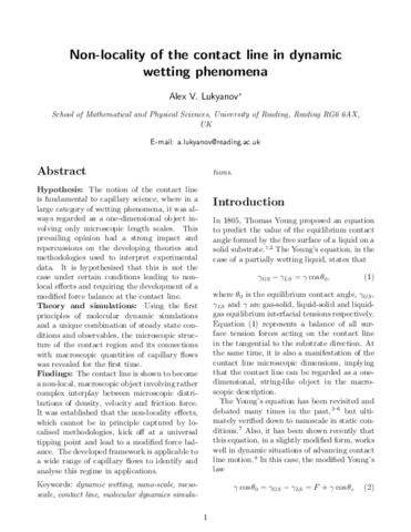 Lukyanov, A. V. (2022) Non-locality of the contact line in dynamic wetting phenomena. Journal of Colloid and Interface Science, 608 (2). pp. 2131-2141. ISSN 0021-9797 doi: 10.1016/j.jcis.2021.10.155