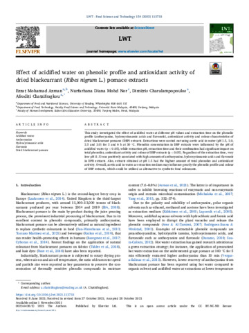 Azman, E. M., Nor, N. D. M., Charalampopoulos, D. orcid id iconORCID: https://orcid.org/0000-0003-1269-8402 and Chatzifragkou, A. orcid id iconORCID: https://orcid.org/0000-0002-9255-7871 (2022) Effect of acidified water on phenolic profile and antioxidant activity of dried blackcurrant (Ribes nigrum L.) pomace extracts. LWT-Food Science and Technology, 154. 112733. ISSN 0023-6438 doi: 10.1016/j.lwt.2021.112733