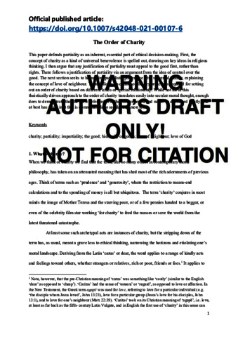 This paper defends partiality as an inherent, essential part of ethical decision-making. First, the concept of charity as a kind of universal benevolence is spelled out, drawing on key ideas from classical religious thinking. I then argue that any justification of partiality must appeal to the good first, rather than rights. There follows a justification of partiality via an argument from the idea of control over the good. The next section seeks to harmonize partialistic preference with universal charity, explaining the concept of love of neighbour. There follows an outline of the key principles required for setting out an order of charity based on different kinds of special relationship. While not all of this theistically driven approach to the order of charity translates easily into secular moral thought, enough does to suggest that the view defended is at the least worthy of consideration and not to be dismissed lightly. At best, it has much in it that is commendable to secular common sense.
