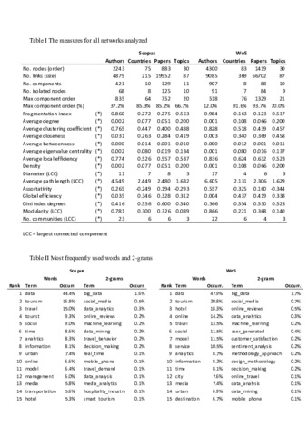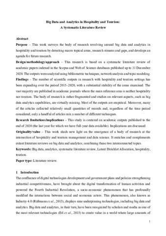Purpose – This work surveys the body of research revolving around big data and analytics in hospitality and tourism by detecting macro topical areas, research streams and gaps, and develops an agenda for future research. Design/methodology/approach – This research is based on a systematic literature review of academic papers indexed in the Scopus and Web of Science databases published up to 31 December 2020. The outputs were analyzed using bibliometric techniques, network analysis and topic modeling. Findings – The number of scientific outputs in research with hospitality and tourism settings has been expanding over the period 2015–2020, with a substantial stability of the areas examined. The vast majority are published in academic journals where the main reference area is neither hospitality nor tourism. The body of research is rather fragmented and studies on relevant aspects, such as big data analytics capabilities, are virtually missing. Most of the outputs are empirical. Moreover, many of the articles collected relatively small quantities of records and, regardless of the time period considered, only a handful of articles mix a number of different techniques. Research limitations/implications – This study is centered on academic outputs published to the end of 2020 (the last year for which we have full-year data available). Implications are discussed. Originality/value – This work sheds new light on the emergence of a body of research at the intersection of hospitality and tourism management and data science. It enriches and complements extant literature reviews on big data and analytics, combining these two interconnected topics.