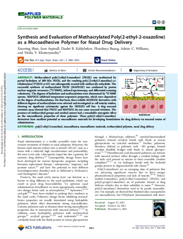 Synthesis and evaluation of methacrylated poly(2-ethyl-2-oxazoline) as a mucoadhesive polymer for nasal drug delivery.