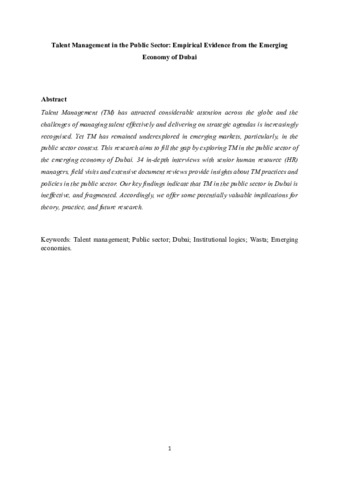 Talent Management (TM) has attracted considerable attention across the globe and the challenges of managing talent effectively and delivering on strategic agendas is increasingly recognised. Yet TM has remained underexplored in emerging markets, particularly, in the public sector context. This research aims to fill the gap by exploring TM in the public sector of the emerging economy of Dubai. 34 in-depth interviews with senior human resource (HR) managers, field visits and extensive document reviews provide insights about TM practices and policies in the public sector. Our key findings indicate that TM in the public sector in Dubai is ineffective, and fragmented. Accordingly, we offer some potentially valuable implications for theory, practice, and future research