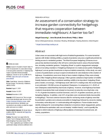 Gazzard, A. orcid id iconORCID: https://orcid.org/0000-0003-0604-7160, Boushall, A., Brand, E. and Baker, P. J. (2021) An assessment of a conservation strategy to increase garden connectivity for hedgehogs that requires cooperation between immediate neighbours: a barrier too far? PLoS ONE, 16 (11). ISSN 1932-6203 doi: 10.1371/journal.pone.0259537