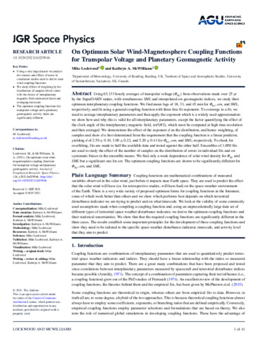 On optimum solar wind – magnetosphere coupling functions for transpolar voltage and planetary geomagnetic activity.