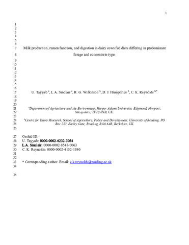 Tayyab, U., Sinclair, L. A., Wilkinson, R. G., Humphries, D. J. and Reynolds, C. K. orcid id iconORCID: https://orcid.org/0000-0002-4152-1190 (2022) Milk production, rumen function, and digestion in dairy cows fed diets differing in predominant forage and concentrate type. Animal Feed Science and Technology, 284. 115151. ISSN 0377-8401 doi: 10.1016/j.anifeedsci.2021.115151