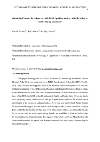 Optimising exposure for adolescents with public speaking anxiety: affect labelling or positive coping statements?