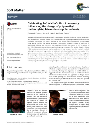 Smith, G. N., Hallett, J. E. orcid id iconORCID: https://orcid.org/0000-0002-9747-9980 and Eastoe, J. (2015) Celebrating Soft Matter's 10th Anniversary: influencing the charge of poly(methyl methacrylate) latexes in nonpolar solvents. Soft Matter, 11 (41). pp. 8029-8041. ISSN 1744-683X doi: 10.1039/c5sm01190f