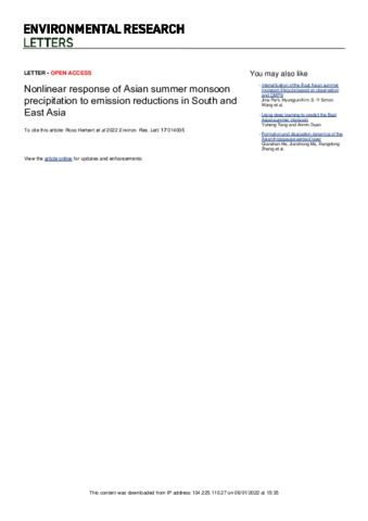 Herbert, R., Wilcox, L. J. orcid id iconORCID: https://orcid.org/0000-0001-5691-1493, Joshi, M., Highwood, E. and Frame, D. (2021) Nonlinear response of Asian summer monsoon precipitation to emission reductions in South and East Asia. Environmental Research Letters, 17 (1). 014005. ISSN 1748-9326 doi: 10.1088/1748-9326/ac3b19