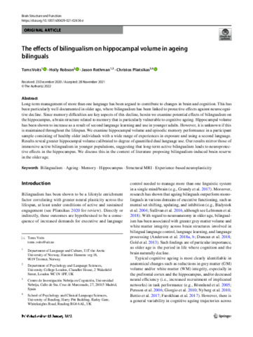 Olsen, R. K., Pangelinan, M. M., Bogulski, C., Chakravarty, M. M., Luk, G., Grady, C. L., & Bialystok, E. (2015). The effect of lifelong bilingualism on regional grey and white matter volume. Brain Research, 1612, 128–139. https://doi.org/10.1016/j.brainres.2015.02.034