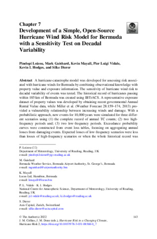 Loizou, P., Guishard, M., Mayall, K., Vidale, P. L. orcid id iconORCID: https://orcid.org/0000-0002-1800-8460, Hodges, K. I. orcid id iconORCID: https://orcid.org/0000-0003-0894-229X and Dierer, S. (2022) Development of a simple, open‐source hurricane wind risk model for Bermuda with a sensitivity test on decadal variability. In: Collins, J. M. and Done, J. M. (eds.) Hurricane Risk in a Changing Climate. Hurricane Risk, 2. Springer. ISBN 9783031085673 doi: 10.1007/978-3-031-08568-0_7