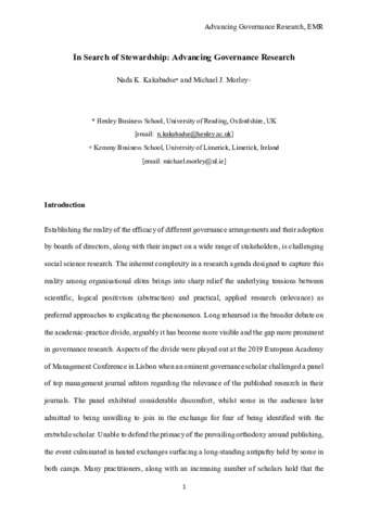 Kakabadse, N. K. orcid id iconORCID: https://orcid.org/0000-0002-9517-8279 and Morley, M. J. (2021) In search of stewardship: advancing governance research. European Management Review, 18 (3). pp. 189-196. ISSN 1740-4762 doi: 10.1111/emre.12493