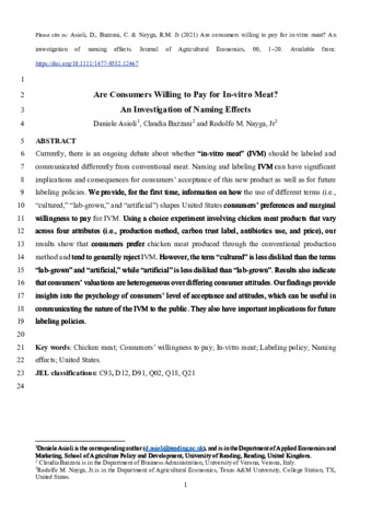 Are consumers willing to pay for in‐vitro meat? An investigation of naming effects.