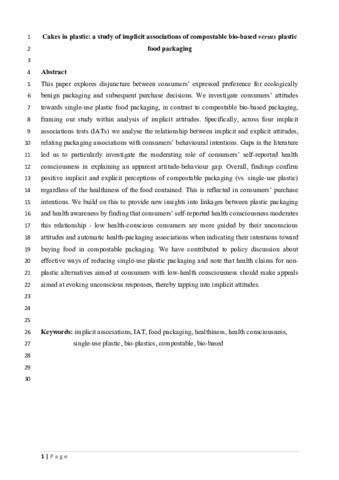 This paper explores the disjuncture between consumers’ expressed preferences for ecologically benign packaging and their subsequent purchase decisions. We investigate consumers’ attitudes towards compostable bio-based food packaging, in contrast to fossil-based plastic packaging, framing our study within analysis of implicit attitudes. We address a gap in knowledge about the moderating effects of consumers’ reported health consciousness on the relationship between implicit health associations with compostable packaging and subsequent purchase intentions. Specifically, across four studies employing Implicit Associations Tests (IATs), we analyse the relationship between implicit and explicit attitudes, relating packaging associations with consumers’ behavioural intentions. Our findings confirm positive implicit (and explicit) perceptions of compostable bio-based packaging (vs. fossil-based plastic) regardless of the healthiness of the food contained. This is reflected in consumers’ purchase intentions. We build on this to incorporate the effects of consumers’ self-reported health consciousness. We find that low health-conscious consumers are more likely to be guided in their compostable packaging decisions by their unconscious and automatic health-packaging associations, than consumers with high health consciousness. We contribute to policy discussion about effective ways of reducing fossil-based plastic packaging use and note that environmental claims for non-plastic alternatives aimed at consumers with low-health consciousness should make appeals based on health benefits, tapping into implicit attitudes to evoke automatic responses.