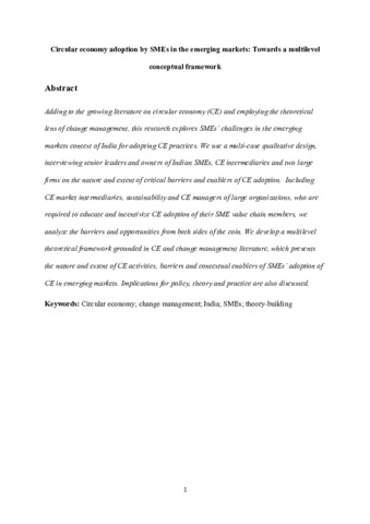 Adding to the growing literature on circular economy (CE) and employing the theoretical lens of change management, this research explores SMEs’ challenges in the emerging markets context of India for adopting CE practices. We use a multi-case qualitative design, interviewing senior leaders and owners of Indian SMEs, CE intermediaries and two large firms on the nature and extent of critical barriers and enablers of CE adoption. Including CE market intermediaries, sustainability and CE managers of large organizations, who are required to educate and incentivize CE adoption of their SME value chain members, we analyze the barriers and opportunities from both sides of the coin. We develop a multilevel theoretical framework grounded in CE and change management literature, which presents the nature and extent of CE activities, barriers and contextual enablers of SMEs’ adoption of CE in emerging markets. Implications for policy, theory and practice are also discussed.